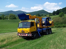 Multi-purpose telescopic excavator UDS 214.41 UDS 214.41 is a self-propelled, multi-purpose landscraping machine installed on TATRA T815 chassis, or another chassis. The machine is designed for landscraping and finishing earth works at the contact point of buildings and surrounding areas, and with suitable tool, also for other earthmoving works (excavating foundation trenches, drainage structures, construction and maintenance of engineering networks, etc.).